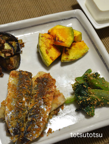 夜ご飯のメインは油で揚げない鰯フライ。揚げない鰯フライ、小松菜の胡麻あえ、ナスの肉味噌炒め、カボチャのソテー、絹ごし豆腐。今夜もお米無しの夜ご飯です。