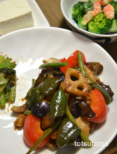夜ご飯のメインは鶏もも肉と野菜の甘酢あん。鶏もも肉と野菜の甘酢あん、小松菜の胡麻あえ、ブロッコリーとエビのサラダ、木綿豆腐。鶏もも肉と野菜の甘酢あんは鶏もも肉、レンコン、エリンギ、ナス、パプリカ、ピーマン、インゲンで。今夜もお米無しの夜ご飯です。