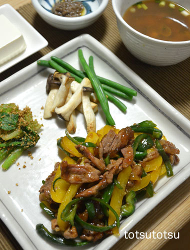 夜ご飯のメインは青椒肉絲。豚肩ロース、ピーマン、黄色パプリカで。豚肉は油を入れずに炒めました。青椒肉絲、小松菜の胡麻あえ、エリンギとインゲンはバーニャカウダーソースで、絹ごし豆腐、シジミのみそ汁。