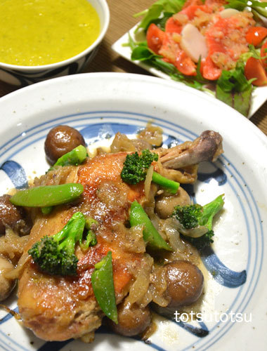 昨日の夜ご飯は1日早いクリスマスチキン。ティファールのフライパンでタマネギ、ブラウンマッシュルーム、ホワイトマッシュルーム、スナップエンドウ、ブロッコリーと一緒に塩、こしょう、すりおろしニンニクで蒸し焼き風にして作りました。骨付きもも肉の蒸し焼き、スモークサーモンとホタテのマリネ風サラダ、カボチャのスープ。イチゴのショートケーキと和栗のモンブラン。
