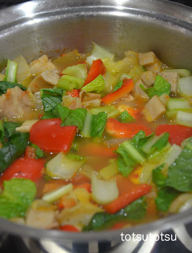 朝ご飯用に具だくさんのスープを作りました。夜ご飯がいらないというので朝に野菜をたくさん食べてもらいましょう。早朝にコトコト煮ましたよ。鶏胸肉、粗挽きウインナー、エリンギ、レンコン、白菜、小松菜、パプリカで。味付けは塩、こしょう。具だくさんのスープ、ロールパン、R1ヨーグルト、豆乳の朝ご飯でした。