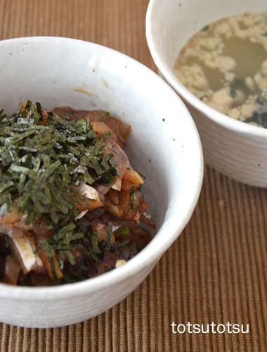 1人のお昼はりゅうきゅう丼。無印の青菜とくずし豆腐の豆乳スープと一緒に。「りゅうきゅう」は鯵や鯖や鰤などのお魚をしょうゆダレに漬ける大分県の郷土料理です。鯵のお刺身で作りました。ネギが無かったのできざみ海苔た〜〜っぷり、しょうゆとショウガのシンプルな味付けです。雑穀米のご飯90gの上にのせて丼に。美味しいですよ〜りゅうきゅう丼。
