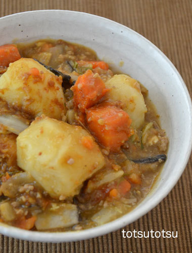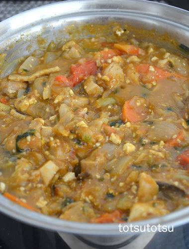 お昼ご飯は前日のポトフをカレーにアレンジ。ポトフはカレーにアレンジする予定で薄味に作っておきました。冷蔵庫で保存すると脂が白く固まるのでそれは取り除き、お肉が少なかったので鶏ひき肉をプラス。