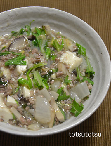 1人の夜ご飯は豚ひき肉と白菜のトロトロ煮。豚ひき肉、たっぷり白菜、干し椎茸、絹ごし豆腐、水菜、水溶き片栗粉でとろみをつけました。お米無しの夜ご飯です。