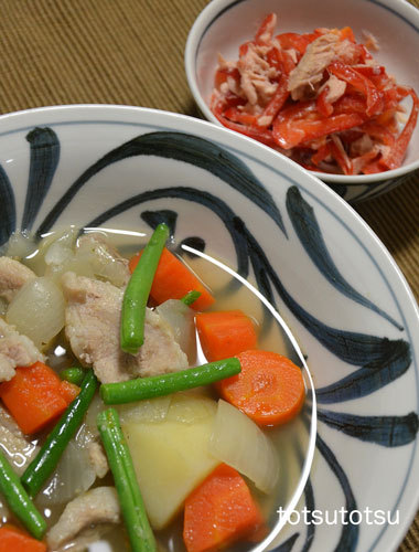 娘と2人の夜ご飯はポトフとパプリカ&ツナのサラダ。豚肉、タマネギ、人参、ジャガイモ、インゲンで。きのこ類が無かったのでしいたけの粉末をだし代わりにプラス。お米無しのご飯です。