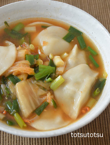 1人のお昼ご飯はキムチ漬けと冷凍水餃子を使ってキムチ餃子スープとりんご。餃子って皮は小麦粉、具のお肉に野菜、これだけでご飯におかずの代わりになるから便利。