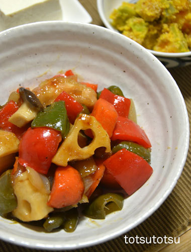 夜ご飯のメインは鶏もも肉と野菜の甘酢あん。鶏もも肉は油を入れずに炒めてレンコン、人参、タマネギ、エリンギ、ピーマン、パプリカで。味付けは黒酢南蛮漬けのたれとポン酢。鶏もも肉と野菜の甘酢あん、カボチャのすりごま入りサラダ、木綿豆腐。