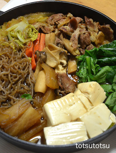 昨日の夜ご飯はすき焼き。我が家はすき焼きのお肉は豚肉です。油を入れずに焼きます。野菜、シラタキ、きのこ類をたっぷり食べてから最後にお肉。お米無しで、すき焼きだけの夜ご飯です。