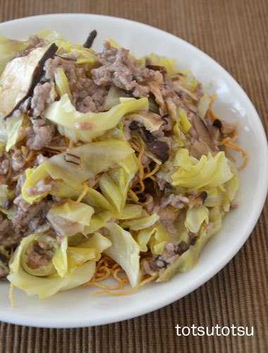 1人のお昼ご飯は豚ひき肉とスライス干し椎茸とキャベツで長崎皿うどん。豚ひき肉は油を入れずに炒めます。ひき肉から出る脂だけでも多いくらいなので余分な脂はキッチンペーパーで拭き取りました。これで少しカロリーダウン。