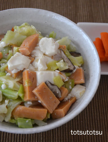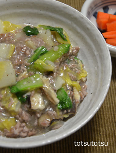 1人の夜ご飯は白菜と豚ひき肉のトロトロ煮と、人参のぬか漬け。白菜、豚ひき肉、干し椎茸、チンゲンサイで。白菜た〜〜っぷり入れました。お米無しの夜ご飯です。