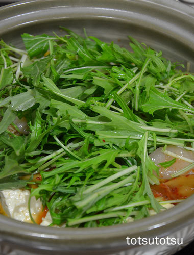 昨日の夜ご飯はキムチ鍋。マイルド味の白菜キムチと桃屋の海鮮キムチの素を使いました。白菜、白菜キムチ、豚肉、エノキ、木綿豆腐、水菜、水餃子。お米無しの夜ご飯です。