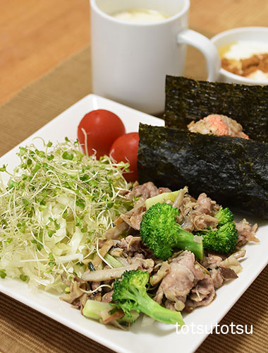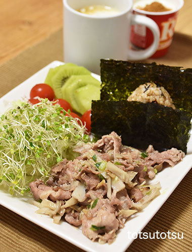 朝ご飯のメインは豚肉とブロッコリーの炒め物。豚肉とブロッコリーときのこミックスの炒め物、鮭フレーク混ぜご飯のおにぎり、キャベツとブロッコリースーパースプラウトと糸寒天の甘酢和え、ミニトマト、自然栽培の玄米甘酒とリンゴ酢入り豆乳、ビヒダスヨーグルト+ハチミツ+シナモン。おにぎりのご飯ははと麦ブレンドの寝かせ玄米ごはんで100gくらいです。