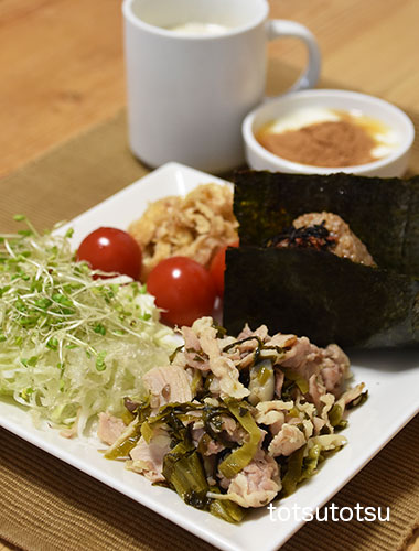 朝ご飯のメインは豚高菜炒め。豚肉ときざみ高菜漬けの炒め物です。豚高菜炒め、明太子ひじきちりめん混ぜご飯のおにぎり、キャベツとブロッコリースーパースプラウトと糸寒天の甘酢和え、ミニトマト、切り干し大根と油揚げのごま和え、ビヒダスヨーグルト+生姜茶+シナモン、自然栽培の玄米甘酒とリンゴ酢入り豆乳。おにぎりのご飯はもち麦ブレンドの寝かせ玄米ごはんで100gくらいです。
