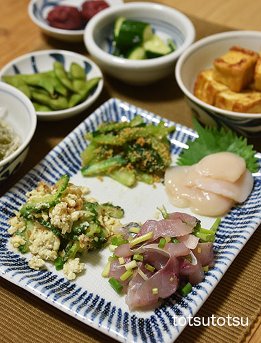 夜ご飯のメインは鯵のたたきとホタテのお刺身。お盆で市場がお休みなのか、最近いつものお魚屋さんに鰯がありません。なので、鰯の次に好きな味を。鯵のたたき、ホタテの刺身、ゴーヤーのおかか卵とじ、小松菜の胡麻和え、厚揚げ、きゅうりの三五八漬け、梅干し、だだちゃ豆、メカブと糸寒天の酢の物。お米無しの夜ご飯です。