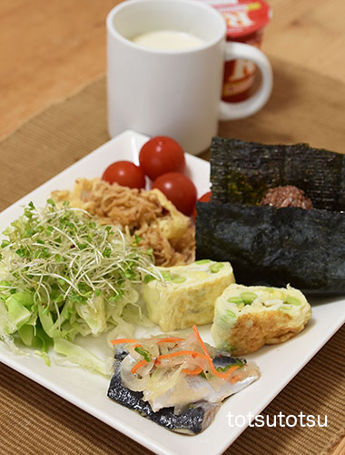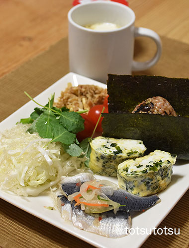 朝ご飯のメインはまいわしマリネ。まいわしマリネは大地を守る会の冷凍食品です。まいわしマリネ、枝豆入り卵焼き、明太子ひじきちりめん混ぜご飯のおにぎり、キャベツとブロッコリースーパースプラウトと糸寒天の甘酢和え、切り干し大根と油揚げのごま和え、ミニトマト、自然栽培の玄米甘酒とリンゴ酢入り豆乳、R1ヨーグルト。おにぎりのご飯は黒米ブレンドの寝かせ玄米ごはんで100gくらいです。