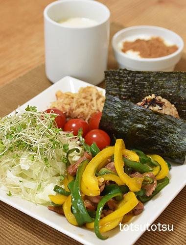 朝ご飯のメインは青椒肉絲。青椒肉絲、明太子ひじきちりめん混ぜご飯のおにぎり、キャベツとブロッコリースーパースプラウトと糸寒天の甘酢和え、ミニトマト、切り干し大根と油揚げのごま和え、自然栽培の玄米甘酒とリンゴ酢入り豆乳、ビヒダスヨーグルト+生姜茶+シナモン。おにぎりのご飯ははと麦ブレンドの寝かせ玄米ごはんで100gくらいです。