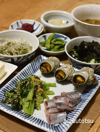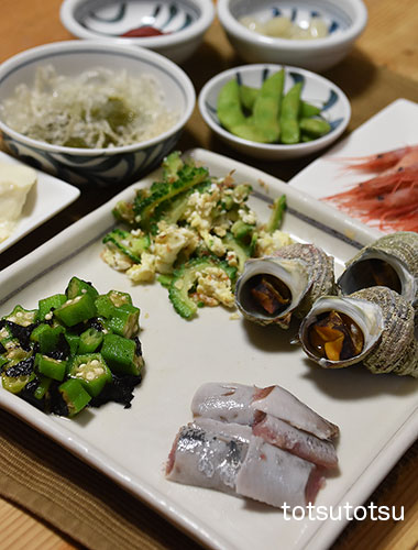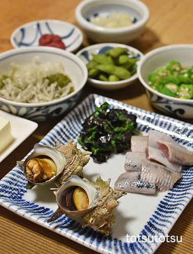 夜ご飯のメインは鰯のお刺身と姫サザエ。姫サザエはサザエの小さいものです。塩茹でにしました。鰯刺身、姫サザエの塩茹で、小松菜の胡麻和え、オクラの海苔和え、だだちゃ豆、ナメコのお味噌汁、らっきょう、梅干し、メカブと糸寒天の酢の物、絹ごし豆腐。ダンナには真だこの刺身も。お米無しの夜ご飯です。