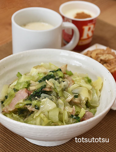 朝ご飯は中華丼。ハム、きのこミックス、た〜〜っぷりキャベツ、小松菜で。ご飯は雑穀米で100gくらいです。中華丼、切り干し大根と油揚げのごま和え、ミニトマト、自然栽培の玄米甘酒とリンゴ酢入り豆乳、R1ヨーグルト+シナモン。