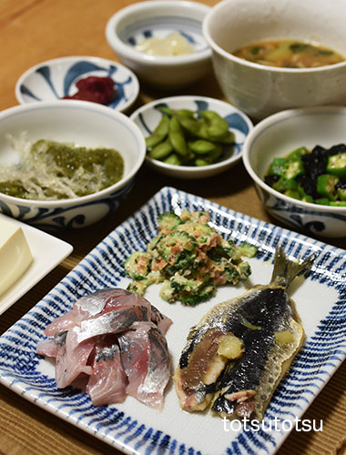 夜ご飯のメインは鰯のお刺身とスルメイカのトマトにんにくオイル炒め。イカをにんにくオイルで炒めミニトマトを加えて塩で味付け。にんにくオイルのにんにくは皮をとって、つぶして使いました。鰯の刺身、イカのトマトにんにくオイル炒め、ゴーヤーの卵とじ、オクラの海苔和え、だだちゃ豆、ナメコと小松菜のお味噌汁、らっきょう、梅干し、メカブと糸寒天の酢の物、納豆。お米なしの夜ご飯です。