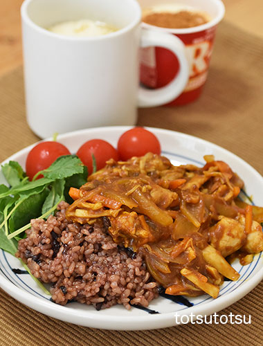 朝ご飯はポークカレー。豚肉、玉ねぎ、人参、じゃがいも、きのこミックス、きのこスープ、冷蔵庫の残り物などなどで。きのこミックスを作る時えのきの根元部分や他のきのこの切れ端や根元部分をまとめて冷凍保存してます。それをコトコト煮てスープを作ってカレーに使いました。ご飯は黒マイブレンドの寝かせ玄米ごはんで100gくらいです。ポークカレー、ベビーケール、ミニトマト、自然栽培の玄米甘酒とリンゴ酢入り豆乳、R1ヨーグルト+シナモン。