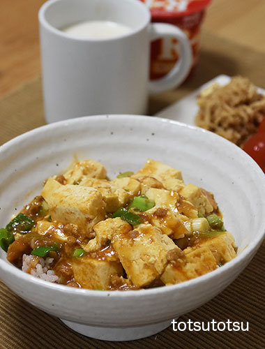 朝ご飯は麻婆豆腐丼。大地を守る会のひき肉入り冷凍麻婆の素、木綿豆腐、ネギで。ご飯は雑穀米で100gくらいです。麻婆豆腐丼、切り干し大根と油揚げのごま和え、ミニトマト、自然栽培の玄米甘酒とリンゴ酢入り豆乳、R1ヨーグルト。