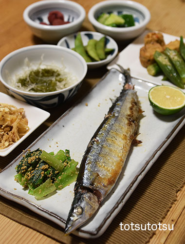 夜ご飯のメインは秋刀魚の塩焼き。今シーズン初です。秋刀魚の塩焼き、小松菜の胡麻和え、がんもどきとオクラの煮物、きゅうりの三五八漬け、梅干し、だだちゃ豆、メカブと糸寒天の酢の物、切り干し大根と油揚げのごま和え。ダンナには生鰹の刺身も。お米無しの夜ご飯です。