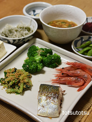 夜ご飯のメインは鯖の塩焼きと甘エビのお刺身。鯖の塩焼き、甘エビの刺身、小松菜の胡麻和え、ブロッコリーのにんにくオイル和え、だだちゃ豆、梅干し、ナメコのお味噌汁、らっきょう、メカブと糸寒天の酢の物、木綿豆腐。お米無しの夜ご飯です。