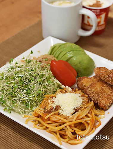 朝ご飯はミートソースパスタ。マ・マーのTHA PASTA 香味野菜のミートソース冷凍パスタです。1人前をダンナと半分ずつで。香味野菜のミートソースパスタ、スパイシーささみカツ、キャベツとブロッコリースーパースプラウトと糸寒天の甘酢和え、ミニトマト、切り干し大根と油揚げのごま和え、アボカド、自然栽培の玄米甘酒とリンゴ酢入り豆乳、R1ヨーグルト+シナモン。スパイシーささみカツは温めるだけで食べられる大地を守る会の冷凍食品です。