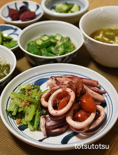 夜ご飯のメインはスルメイカのトマトにんにくオイル炒め。スルメイカをにんにくオイルで炒め、にんにくオイルのにんにくとミニトマトをプラス。スルメイカのにんにくオイル炒め、小松菜の胡麻和え、ナメコのお味噌汁、オクラの鰹削り節和え、メカブと糸寒天の酢の物、きゅうりの三五八漬け、梅干し、だだちゃ豆。ダンナには鰹の刺身も。お米無しの夜ご飯です。