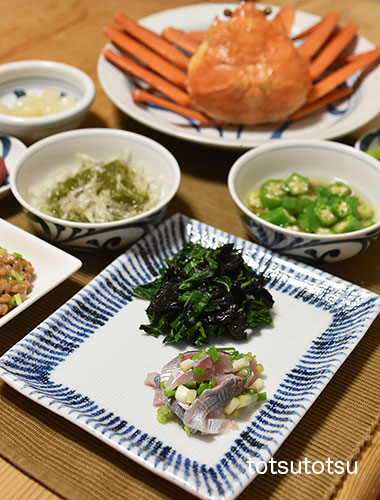 夜ご飯のメインは鯵のお刺身と茹で紅ズワイガニ。鯵の刺身、モロヘイヤの海苔和え、オクラのおかか和え、枝豆、茹で紅ズワイガニ、メカブと糸寒天の酢の物、らっきょう、梅干し、納豆。お米無しの夜ご飯です。