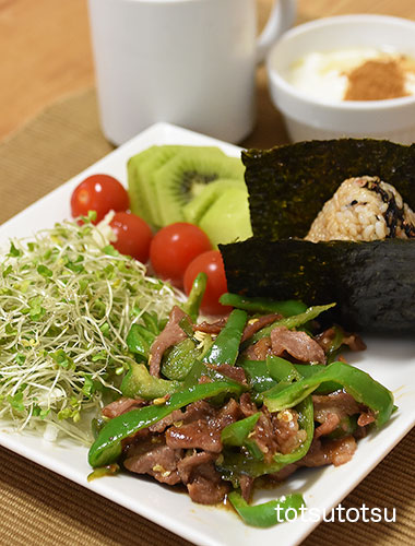 朝ご飯のメインは青椒肉絲。青椒肉絲、明太子ひじきちりめん混ぜご飯のおにぎり、キャベツとブロッコリースーパースプラウトと糸寒天の甘酢和え、ミニトマト、キウイフルーツ、自然栽培の玄米甘酒とリンゴ酢入り豆乳、ビヒダスヨーグルト+ハチミツ+シナモン。おにぎりのご飯ははと麦ブレンドの寝かせ玄米ごはんで100gくらいです。