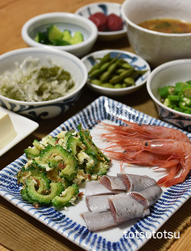 夜ご飯のメインは鰯と甘エビのお刺身。鰯と甘エビの刺身、ゴーヤーのおかか卵とじ、オクラの海苔和え、だだちゃ豆、なめこと小松菜のお味噌汁梅干し、きゅうりの三五八漬け、メカブと糸寒天の酢の物、絹ごし豆腐。お米無しの夜ご飯です。