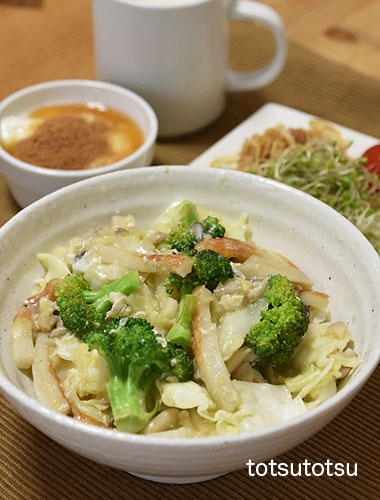 朝ご飯は中華丼。ちくわ、きのこミックス、た〜〜っぷりきゃべつ、卵、ブロッコリーで。ご飯は雑穀米で100gくらいです。中華丼、ブロッコリースーパースプラウト、切り干し大根と油揚げのごま和え、ミニトマト、ビヒダスヨーグルト+生姜茶+シナモン、自然栽培の玄米甘酒とリンゴ酢入り豆乳。