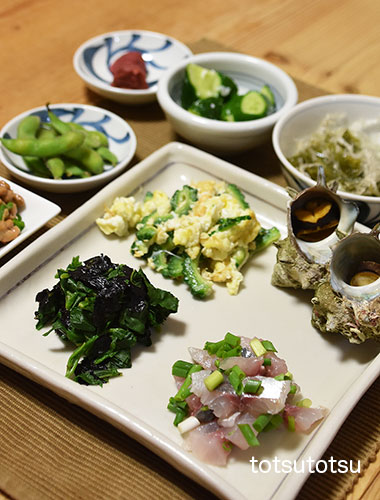 夜ご飯のメインは鯵のたたきとサザエ。鯵のたたき、サザエ、モロヘイヤの海苔和え、ゴーヤーの卵とじ、メカブと糸寒天の酢の物、きゅうりの三五八漬け、梅干し、枝豆、納豆。お米無しの夜ご飯です。