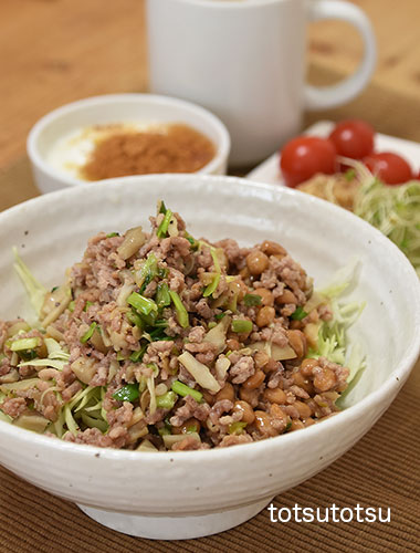 朝ご飯は納豆ひき肉丼。豚ひき肉、ネギ、納豆、きのこミックス、た〜〜〜っぷりキャベツで。ご飯は雑穀米で100gくらいです。納豆の成分のナットウキナーゼは心筋梗塞や脳梗塞の原因になる血栓を予防する効果があるのですが熱に弱く70℃で死滅してしまうとか。なので納豆ひき肉丼を作る時は豚ひき肉とネギなどを炒めた後火を消しちょっと冷まし冷蔵庫から出したての納豆をサッと混ぜ合わせてます。たぶん70℃以下にクリアできてるんじゃないかと・・・。納豆ひき肉丼、ブロッコリースーパースプラウト、切り干し大根と油揚げのごま和え、ミニトマト、ブルガリアヨーグルト+生姜茶+シナモン、自然栽培の玄米甘酒とリンゴ酢入り豆乳。