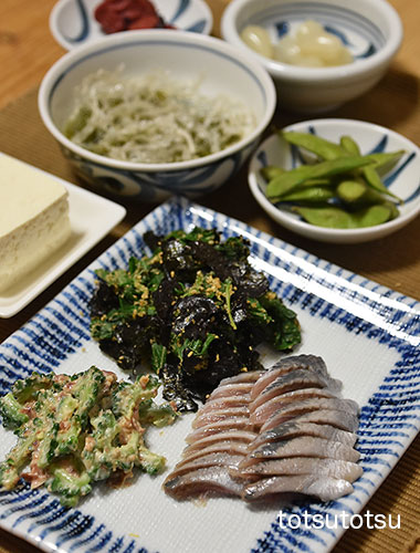 夜ご飯のメインは秋刀魚のお刺身。秋刀魚は生ではなく解凍されたものでした。秋刀魚刺身、ゴーヤーのおかかマヨネーズ和え、小松菜の胡麻和え、ナメコのお味噌汁、だだちゃ豆、梅干し、らっきょう、メカブと糸寒天の酢の物、胡麻豆腐。ダンナには生鰹の刺身も。お米無しの夜ご飯です。