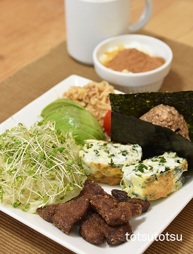 朝ご飯のメインは豚レバーの唐揚げ。豚レバーの唐揚げは大地を守る会の冷凍食品です。豚レバーの唐揚げ、わかめふりかけ入り卵焼き、明太子ひじきちりめん混ぜご飯のおにぎり、キャベツとブロッコリースーパースプラウトと糸寒天の甘酢和え、アボカド、ミニトマト、切り干し大根と油揚げのごま和え、ビヒダスヨーグルト+生姜茶+シナモン、自然栽培の玄米甘酒とリンゴ酢入り豆乳。おにぎりのご飯はもち麦ブレンドの寝かせ玄米ごはんで100gくらいです。
