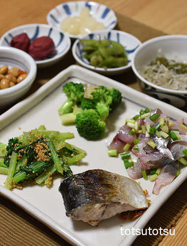 夜ご飯のメインは鯖の塩焼きと鯵のたたき風。鯖の塩焼き、鯵のたたき風、小松菜の胡麻和え、ブロッコリーのにんにくオイル和え、メカブと糸寒天の酢の物、だだちゃ豆、らっきょう、梅干し、大豆の五目煮。お米無しの夜ご飯です。
