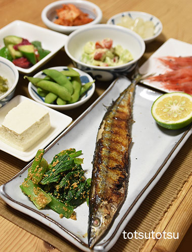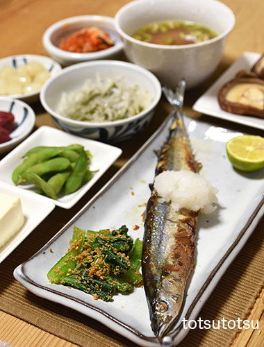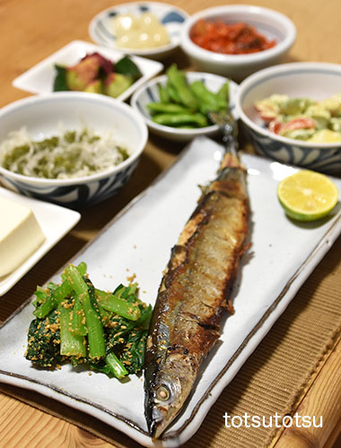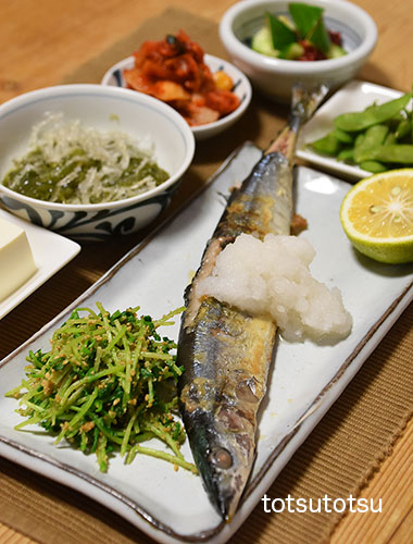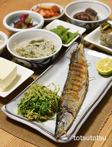 夜ご飯のメインは秋刀魚の塩焼き。秋刀魚塩焼き、小松菜の胡麻和え、ミニトマトとアボカドのマヨネーズ和え、冷凍茶豆、白菜キムチ、らっきょう、キュウリの梅和え、メカブと糸寒天の酢の物、絹ごし豆腐。ダンナには剣先イカの刺身も。お米無しの夜ご飯です。