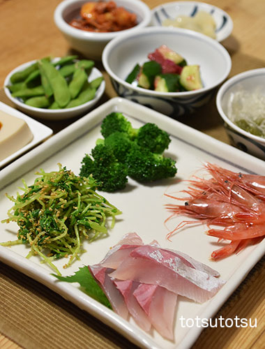 夜ご飯のメインは鰯と甘エビのお刺身。鰯と甘エビの刺身、小松菜の胡麻和え、切り干し大根と油揚げの胡麻和え、メカブと糸寒天の酢の物、冷凍茶豆、梅干し、らっきょう、白菜イカキムチ、絹ごし豆腐。ダンナには鰯の塩焼きも。お米無しの夜ご飯です。