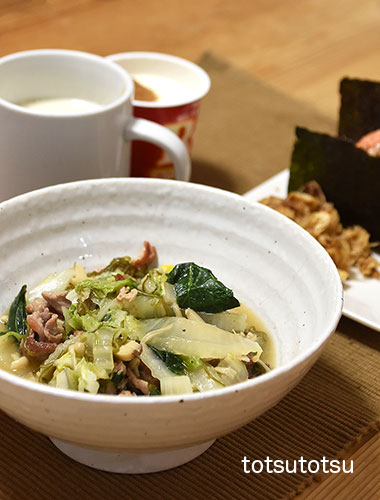 朝ご飯のメインは豚肉と白菜のスープ煮。豚肉と白菜のスープ煮は豚肉、きのこミックス、白菜、小松菜で。豚肉と白菜のスープ煮、切り干し大根と油揚げのごま和え、鮭フレーク混ぜご飯のおにぎり、自然栽培の玄米甘酒とリンゴ酢入り豆乳、R1ヨーグルト+シナモン。おにぎりのご飯は大豆ブレンドの寝かせ玄米ごはんで90gくらいです。