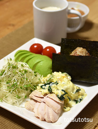 朝ご飯のメインは蒸し鶏。鶏むね肉の蒸し鶏スライス、解凍してそのまま食べられる大地を守る会の冷凍食品です。蒸し鶏、小松菜とチーズ入りスクランブエッグ、鮭フレーク混ぜご飯のおにぎり、キャベツとブロッコリースーパースプラウトと糸寒天の甘酢和え、アボカド、ミニトマト、自然栽培の玄米甘酒とリンゴ酢入り豆乳、ビヒダスヨーグルト+ハチミツ+シナモン。