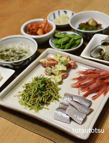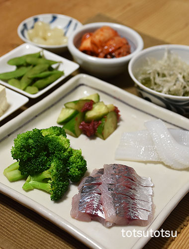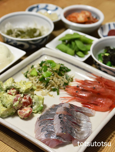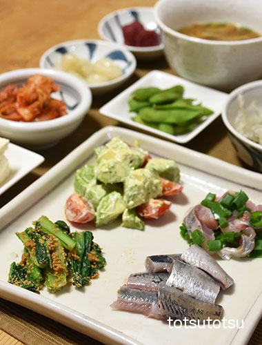 夜ご飯のメインは鰯のお刺身と鯵のたたき。鰯の刺身、鯵のたたき、小松菜の胡麻和え、アボカドとミニトマトのマヨネーズ和え、メカブと糸寒天の酢の物、冷凍茶豆、牡蠣のお味噌汁、梅干し、らっきょう、白菜キムチ、木綿豆腐。ダンナには鰯の塩焼きも。お米無しの夜ご飯です。