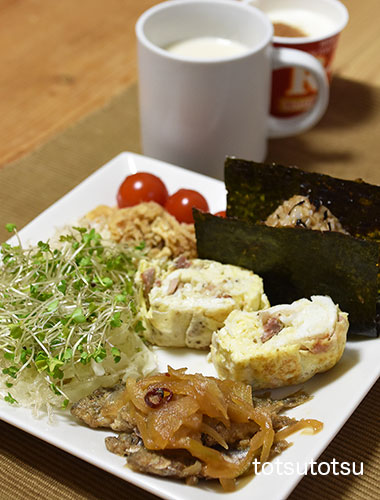 朝ご飯のメインは鯵の南蛮漬け。鯵の南蛮漬けは大地を守る会の冷凍食品です。鯵南蛮漬け、ハム入り卵焼き、シソひじきちりめん混ぜご飯のおにぎり、キャベツとブロッコリースーパースプラウトと糸寒天の甘酢和え、切り干し大根と油揚げの胡麻和え、ミニトマト、自然栽培の玄米甘酒とリンゴ酢入り豆乳、R1ヨーグルト+シナモン。おにぎりのご飯は大豆ブレンドの寝かせ玄米ごはんで90gくらいです。