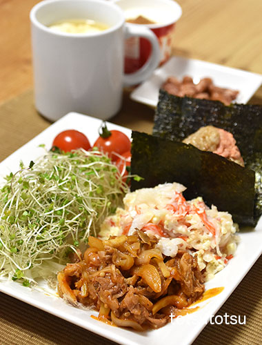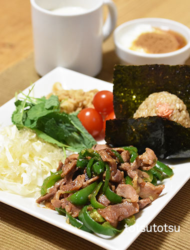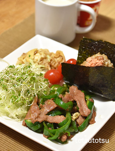 朝ご飯のメインは青椒肉絲。青椒肉絲、鮭フレーク混ぜご飯のおにぎり、キャベツとブロッコリースーパースプラウトと糸寒天の甘酢和え、ミニトマト、切り干し大根と油揚げの胡麻和え、自然栽培の玄米甘酒とリンゴ酢入り豆乳、R1ヨーグルト+シナモン。おにぎりのご飯は大豆ブレンドの寝かせ玄米ごはんで90gくらいです。