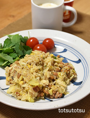 朝ご飯は納豆炒飯。AJINOMOTOのザ・チャーハン、た〜っぷりキャベツ、きのこミックス、納豆で。ザ・チャーハンは半袋をダンナと半分ずつ。納豆炒飯、ベビーケール、ミニトマト、自然栽培の玄米甘酒とリンゴ酢入り豆乳、R1ヨーグルト+シナモン。