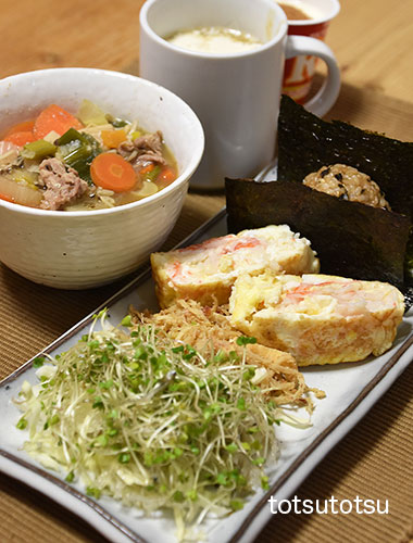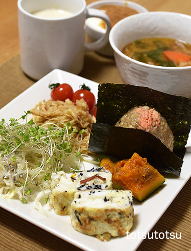 朝ご飯のメインは豚汁。豚汁、明太子ひじきちりめん入り卵焼き、かぼちゃの煮物、鮭フレーク混ぜご飯のおにぎり、キャベツとブロッコリースーパースプラウトと糸寒天とかえりいりこの甘酢和え、切り干し大根と油揚げの胡麻和え、ミニトマト、自然栽培の玄米甘酒とリンゴ酢入り豆乳、ビヒダスヨーグルト+ハチミツ+シナモン。おにぎりのご飯は大豆ブレンドの寝かせ玄米ごはんで90gくらいです。