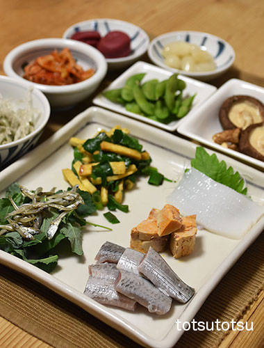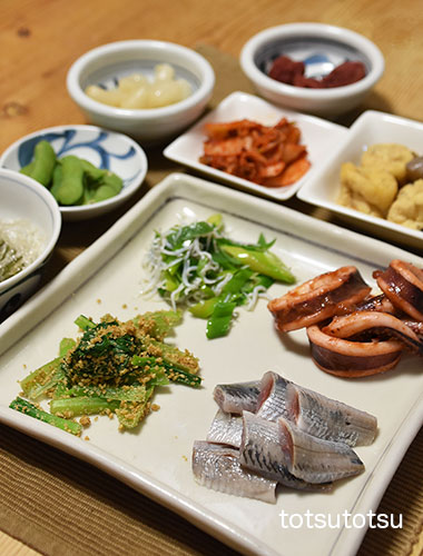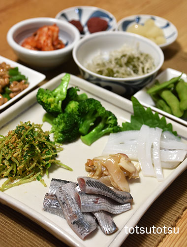 夜ご飯のメインは鰯のお刺身とスルメイカのトマトにんにくオイル炒め。鰯の刺身、スルメイカのトマトにんにくオイル炒め、小松菜の胡麻和え、九条ねぎとしらすの炒め物、一口がんもとこんにゃくの煮物、白菜キムチ、梅干し、らっきょう、冷凍茶豆、メカブと糸寒天の酢の物。ダンナには鰯の塩焼きも。お米無しの夜ご飯です。