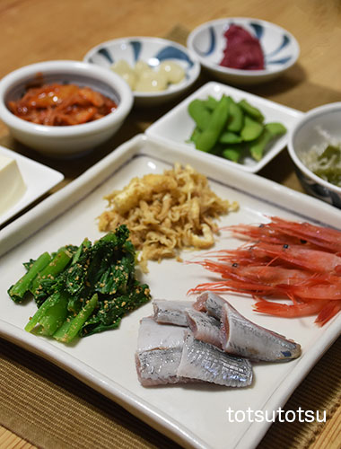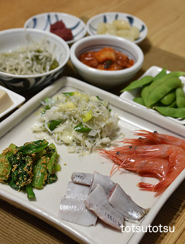 夜ご飯のメインは鰯と甘エビのお刺身。鰯と甘エビの刺身、小松菜の胡麻和え、九条ねぎとしらすの炒め物、冷凍茶豆、白菜キムチ、らっきょう、梅干し、メカブと糸寒天の酢の物、胡麻豆腐。ダンナには鰯の塩焼きも。お米無しの夜ご飯です。