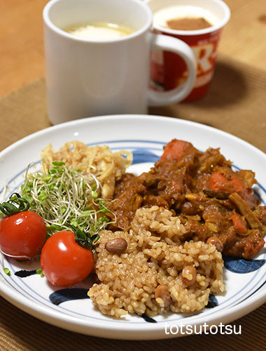 朝ご飯はポークカレー。ご飯は大豆ブレンドの寝かせ玄米ごはんで90gくらいです。ポークカレー、ベビーケール、切り干し大根と油揚げの胡麻和え、ミニトマト、自然栽培の玄米甘酒とリンゴ酢入り豆乳、R1ヨーグルト+シナモン。